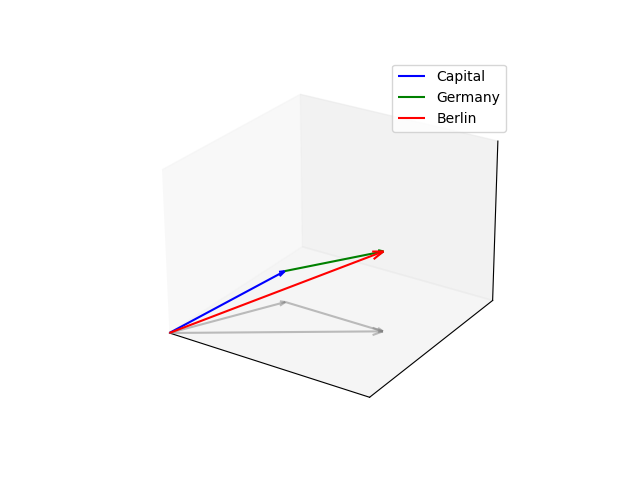 La oss se på et eksempel for å klargjøre dette. Vi tar utgangspunkt i ordene Tyskland og Berlin og oversetter disse til hver sin vektorrepresentasjon ved hjelp av en embedding-modell. Hvis vi da ser på vektorrepresentasjonene til Tyskland og Berlin vil vi oppdage at de peker i omtrent samme retning i vektorrommet fordi de begge er relatert til noe tysk. I tillegg, hvis vi tar Berlin-vektoren og trekker fra Tyskland-vektoren, så kommer den resulterende totalvektoren mest sannsynlig til å være veldig nærme vektorrepresentasjonen til ordet “Hovedstad”.