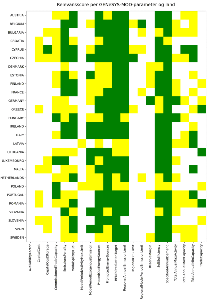 Retriever-delen av systemet fungerer som sagt relativt raskt, og da er det en smal sak å få en oversikt over hvilke land sine NECPer som inneholder avsnitt som er relevante for ulike GENeSYS-MOD-parametere. Figuren under viser en relevansscorematrise der grønne ruter viser funn med en relevansscore over 0,8 for ønsket parameter i landets NECP. Tilsvarende er det gule ruter hvis relevansscoren er mellom 0,5 og 0,8, også har vi hvite ruter hvis relevansscoren er lavere enn 0,5.