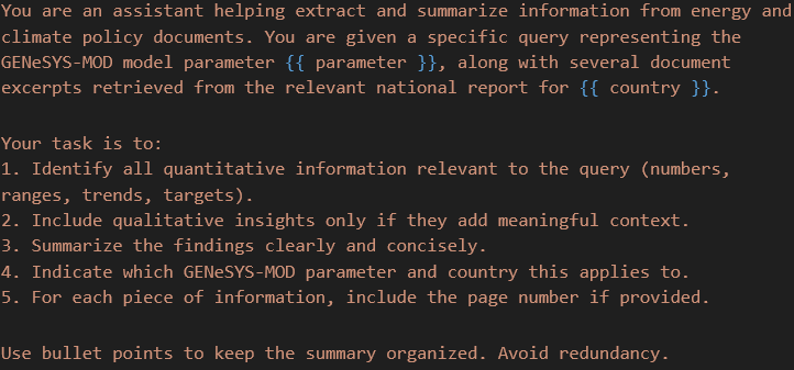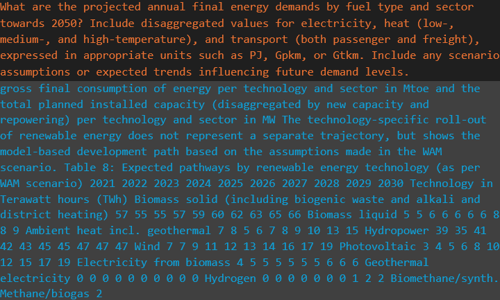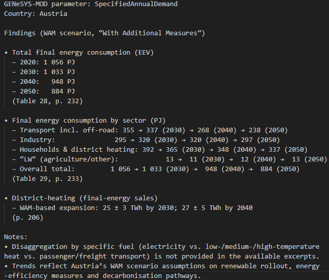 For hver GENeSYS-MOD-parameter og for hvert land blir svaret fra generatoren lagret i en txt-fil. Figur 5 viser generatoroppsummeringen for SpecifiedAnnualDemand og Østerrike. Slik blir altså relevant informasjon i NECPer samlet og oppsummert av RAG-prosesskjeden, og forhåpentligvis vil resultatene fra dette prosjektet føre til tidsbesparelser i søken etter relevant energi- og klima-data og bidra til mer virkelighetsnære simuleringer av det europeiske energisystemet.