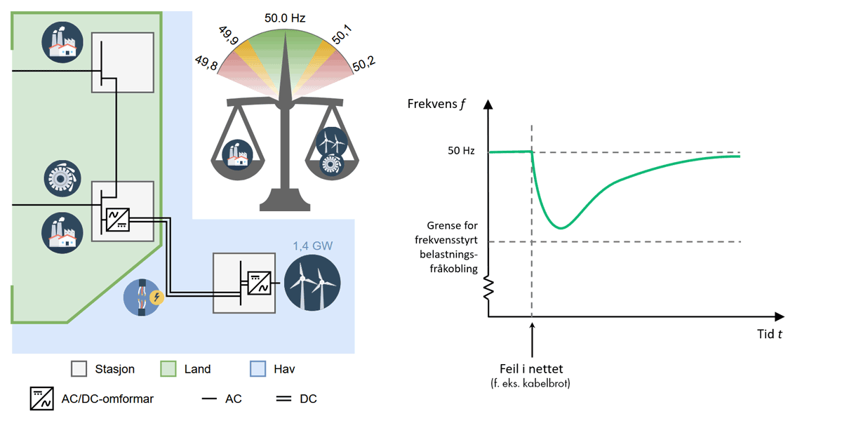 Venstre del av Figur 2 viser eit skjematisk bilete av ein havvindpark knytt til eit (HVAC-) landnett via ein HVDC-kabel. La oss seie at dette landnettet representerer det nordiske kraftsystemet. Havvindparken har installert kapasitet på 1,4 GW, men på grunn av variasjon i vindhastigheit vil han mykje av tida produsere mindre effekt enn dette. Ved ein feil i havnettet (HVDC-kabelen) er det opp til 1,4 GW innmata effekt som dett ut, sett frå landnettet, og frekvensen vil variere i tid f.eks. som vist i venstre del av Figur 2. Dess meir effekt som dett ut, og dess mindre tregleik ein har i kraftsystemet, dess raskare fell frekvensen.