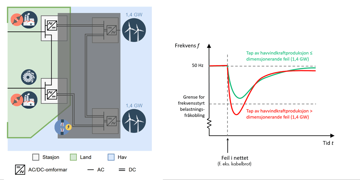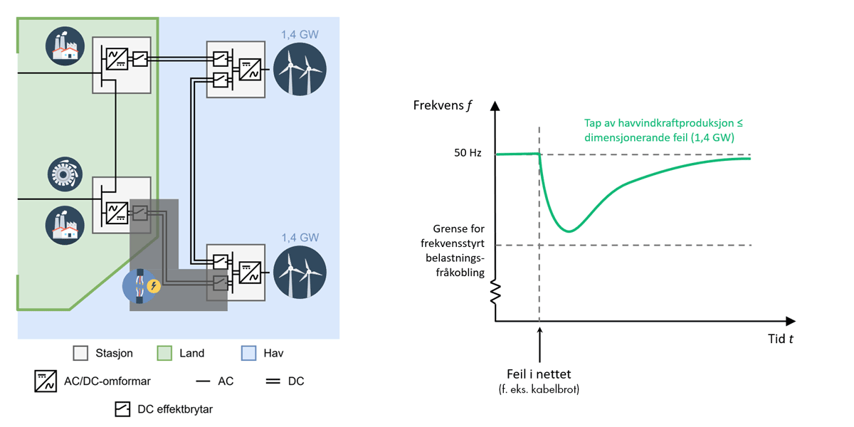Venstre del av Figur 3 viser eit mogleg kopla hav- og landnett der det har kome to havvindparkar og ein HVDC-kabel mellom dei som kan brukast til å avlaste nettet til lands og styre kvar havvindkrafta skal førast i land. Når ein har fleire vegar som krafta kan gå i nettet kallar ein det eit maska nett. I maska HVAC-nett til lands har ein vernsystem for å oppdage feil og opne såkalla effektbrytarar som kan bryte feilstraumen og isolere feilen. Dette vernar resten av kraftsystemet og tillét at krafta framleis kan overførast dei vegane i nettet som er utan feil. Men om ein feil skjer ein stad i HVDC-nettet i Figur 3 må ein kople ut heile havnettet, og dermed all havvindproduksjon. Det medfører ein betydeleg risiko for at frekvensen fell så djupt at ein må kople ut forbruk for å unngå frekvenskollaps. Det gjer at eit slikt kopla hav- og landnett er sårbart med omsyn til feil i havnettet.