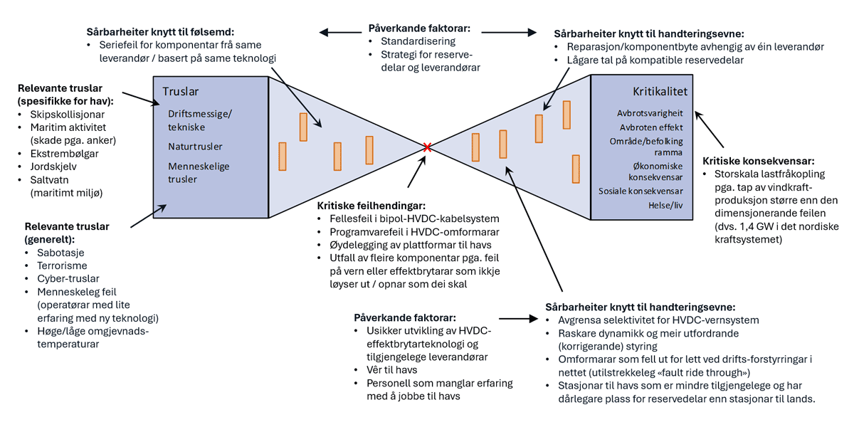 Systemtregleik og dimensjonerande feil var to av fleire aspekt analysert i sårbarheitsanalysen. Resultata frå heile analysen er oppsummert i Figur 4. I tillegg til sårbarheiter som den knytt til tilgjengelegheita til HVDC-effektbrytarar så er kritiske feilhendingar og relevante truslar plassert i tversoversløyfemodellen.