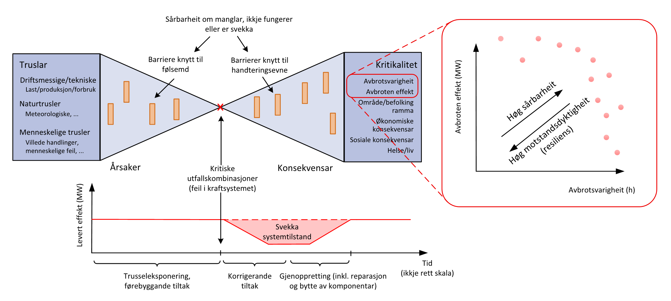 Eit kraftsystem kan i prinsippet oppleve jamt høg forsyningssikkerheit over fleire år, og samtidig vere sårbart med omsyn til sjeldne (ekstraordinære) hendingar med omfattande og/eller langvarige straumbrot. Ein sårbarheit kan forståast som ein mangelfull barriere mot slike kritiske konsekvensar. Dette er illustrert i Figur 1 nedanfor, som viser ein variant av «tversoversløyfe-modellen» (engelsk: «bow-tie model») som ofte brukast i risikovurdering.