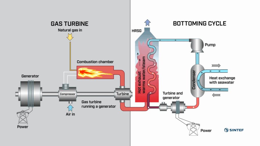 Én måte å gjøre dette på er å utnytte varmen i eksosen fra turbinene, som kan være mellom 400 og 600 °C. I stedet for å slippe denne varmen ut i atmosfæren, kan den brukes til å produsere mer energi. Det kan vi gjøre ved å installere en bunnsyklus (bottoming cycle), et system som gjenbruker varmen – på de gassturbinene som allerede finnes på plattformene.