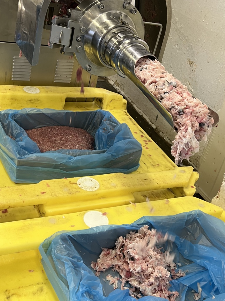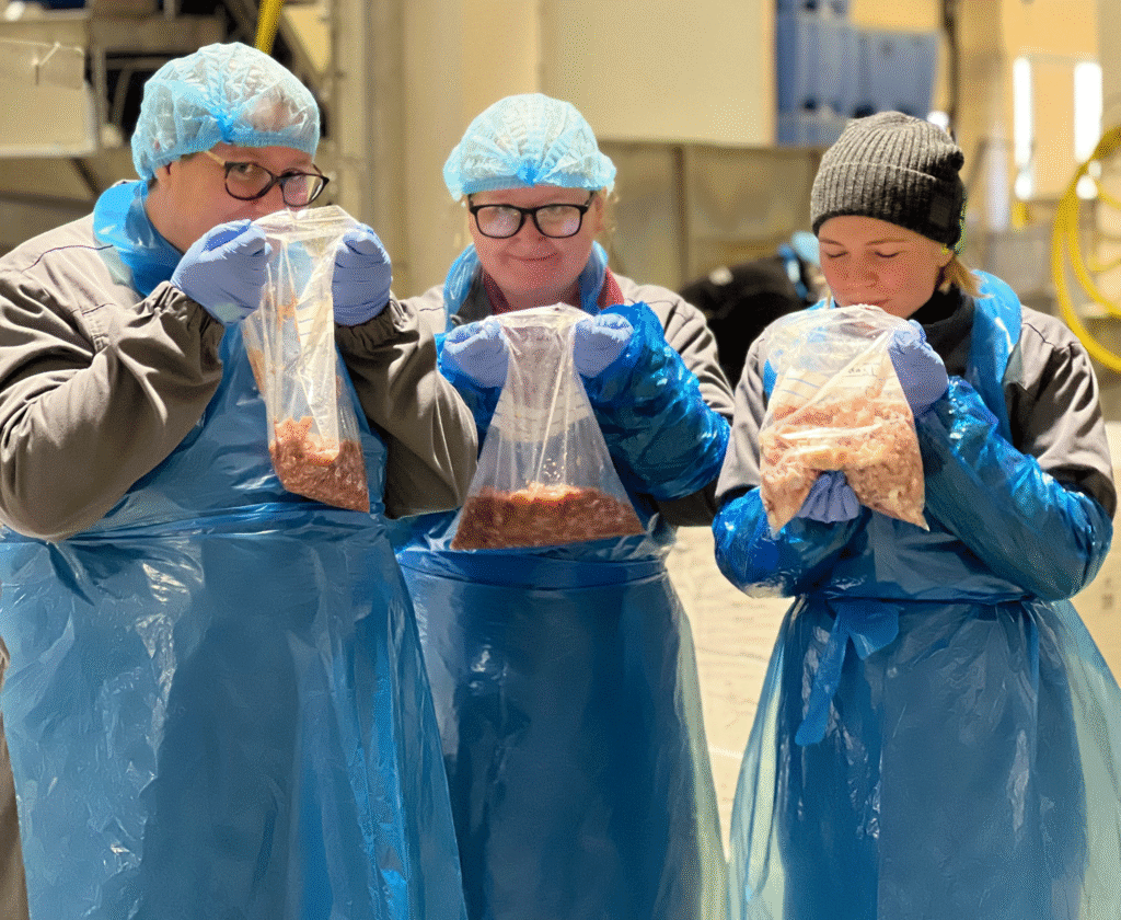 Hos Br. Karlsens hvitfiskmottak på Husøya i hjertet av Senja, kjørte vi ferske torskehoder direkte i separatoren. Ut kom én beinfraksjon og én kjøttfraksjon. Vi utforsket hvordan ulike innstillinger på separatoren påvirket utfallet, og vi så tydelige forskjeller i farge og konsistens mellom de to fraksjonene.