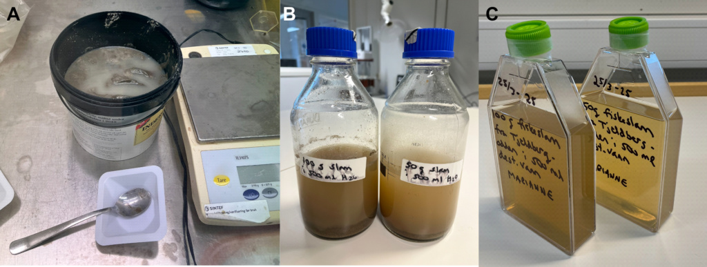 Avløpsvannet fra dette anlegget var derfor uegnet som vekstmedium for mikroalger. Vi bestemte oss derfor for å lage et ekstrakt fra fiskeslammet i stedet (Figur 1). Etter at vi hadde løst fiskeslammet i vann, varmebehandlet det for å trekke ut næringsstoffer og drepe bakterier og eventuelle virus, så påviste vi: