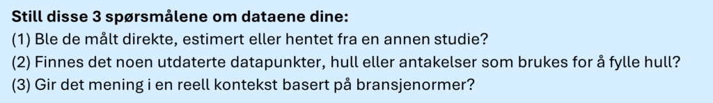 For dette trenger vi masse data. Dessverre er det meste av dataene fra norske selskaper ikke gode nok. Dette betyr at kundene ikke fullt ut kan stole på karbonavtrykket til produktene de kjøper. Derfor må selskapene bruke mer på å forbedre kvaliteten på dataene sine. Selskaper er ikke klar over at dataene de bruker til å beregne miljøpåvirkningen også kan brukes til å forbedre driften (f.eks. salg, innkjøp og vedlikehold). Faktisk kan forbedring av datakvaliteten føre til store økonomiske fordeler for disse selskapene, i tillegg til økt tillit blant kundene deres.