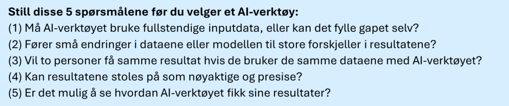 Men data med dårlig kvalitet er bare ett aspekt. Å velge riktig AI-verktøy er en annen. AI er en boks med mange verktøy. Noen er gode for innsamling eller behandling av data, og andre er gode for miljøpåvirkningsberegninger. Uten å være ekspert på AI er det veldig vanskelig å vite hvilket AI-verktøy man skal bruke til hva. Vi så på elleve AI-verktøy og listet opp hvilke verktøy som brukes til hvilket trinn i miljøvurderingen. Vi sjekket dem også mot de fem AI-spørsmålene. Ingen av AI-verktøyene svarte perfekt på de gitte spørsmålene. Noen faser har flere mulige AI-verktøy, men du må se på hvordan de scorer mot de fem AI-spørsmålene og deretter velge det beste. Du trenger ikke ta den avgjørelsen alene. Det er best å involvere folk som kjenner til AI og databehandling, miljøvurdering og produksjonsprosessen for produktet. Dette betyr at folk velger AI-verktøyet.